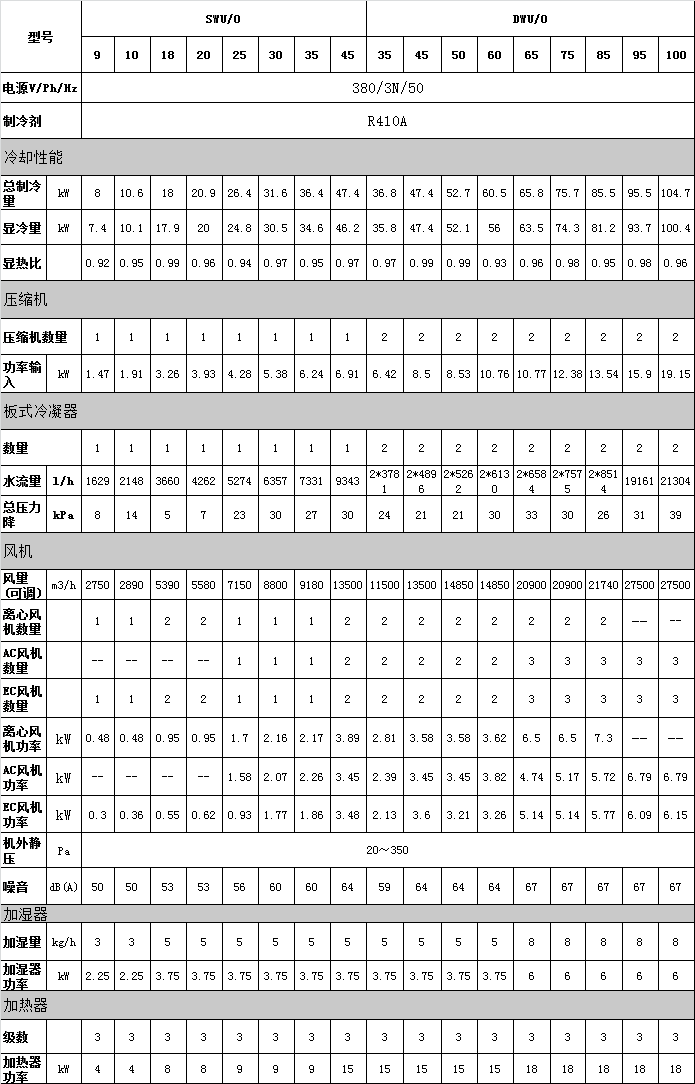 (4)- 表格中電加熱量與加濕量為標(biāo)準(zhǔn)配置,如客戶需要增大機(jī)組加熱或加濕能力,請(qǐng)咨詢我公司。