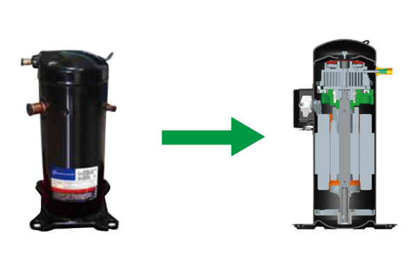 低溫強(qiáng)熱風(fēng)冷模塊機(jī)組采用美國谷輪增強(qiáng)型噴氣增焓渦旋壓縮機(jī)和蒸汽噴射系統(tǒng),制熱運(yùn)行時(shí),實(shí)現(xiàn)準(zhǔn)雙級壓縮,在不增加耗電量的前提下,提高了制熱量和能效比。