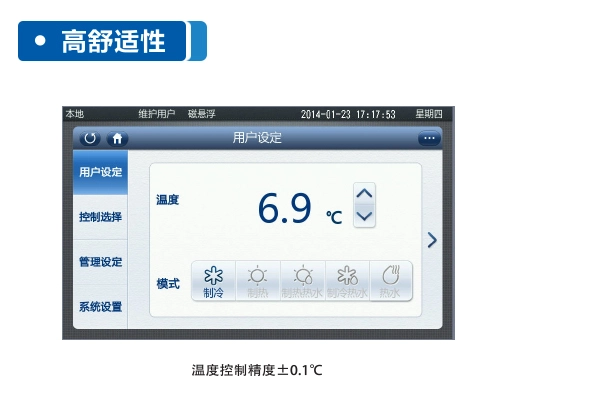 采用磁懸浮變頻壓縮機,機組可實現(xiàn)2%100%負(fù)荷連續(xù)智能調(diào)節(jié),出水溫度控制精度±0.1℃,溫度波動小,舒適性高。