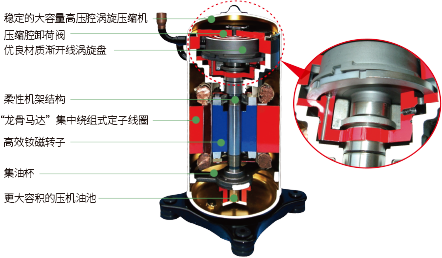 *注:側(cè)出風機型采用直流變頻雙轉(zhuǎn)子壓縮機,頂出風機型采用直流變頻渦旋壓縮機。右圖以224型頂出風室外機產(chǎn)品的壓縮機為例。