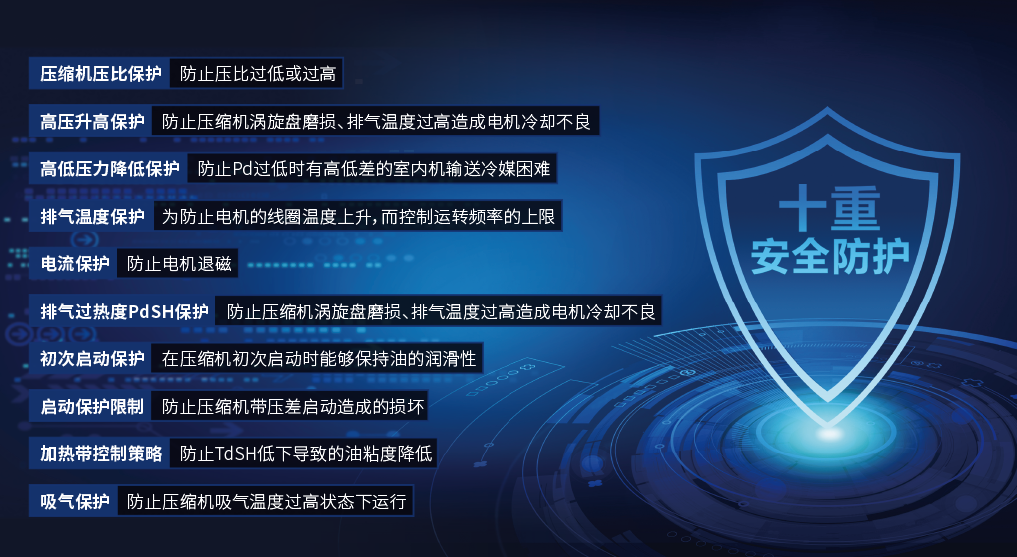 對中央空調(diào)的心臟——壓縮機,應用十重安全防護措施,確保了壓縮機的安全可靠穩(wěn)定運行,從而使系統(tǒng)工作更穩(wěn)定、壽命更長。