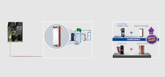 Hybrid混合型高效換熱器可實(shí)現(xiàn)冷媒過冷卻,提高循環(huán)換熱效率。同時(shí),SUPER DVM S還采用了結(jié)構(gòu)緊湊,換熱高效的板式換熱器作為過冷卻器,實(shí)現(xiàn)進(jìn)一步二級(jí)過冷卻,減少冷媒在管道中流動(dòng)時(shí)的壓力損失,進(jìn)一步提升系統(tǒng)性能。