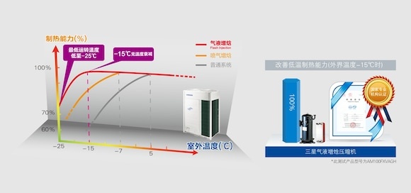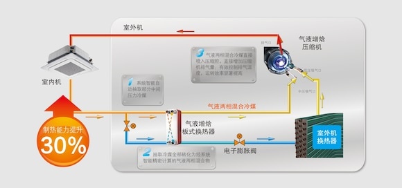 每一臺(tái)SUPER DVM S 產(chǎn)品的壓縮機(jī),都采用了三星高效的氣液增焓技術(shù)。通過抽取部分中間壓力冷媒,將主循環(huán)冷媒進(jìn)行過冷卻提高效率的同時(shí),顯著增加了壓縮機(jī)的排氣量,也有效抑制了排氣溫度過高,使系統(tǒng)在嚴(yán)寒氣候下制熱能力提升35%,在制冷時(shí)亦可增加10%-15%冷媒量,并自動(dòng)調(diào)節(jié)壓縮機(jī)頻率,有效提升系統(tǒng)滿負(fù)荷及低負(fù)荷工況下的系統(tǒng)效率。